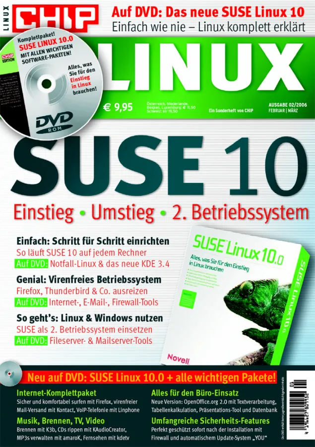 Das aktuelle CHIP-Linux-Sonderheft zeigt in Schritt-für-Schritt-Workshops und Tipps-Strecken, wie Einsteiger und Windows-Umsteiger sofort mit SUSE Linux 10 klarkommen. Auch wer Linux zunächst als zweites Betriebssystem neben Windows betreiben will, findet in diesem Heft die wichtigsten Informationen. Ob man sich für das neueste Büropaket OpenOffice.org 2.0 interessiert, mit GIMP oder Inkscape Bilder professionell gestalten möchte oder lieber Filme und Musik bearbeiten und brennen will – das neue CHIP-Sonderheft liefert perfekte Anleitungen und ausgefallene Profi-Tipps für alle Anwendungen auf der Heft-DVD.