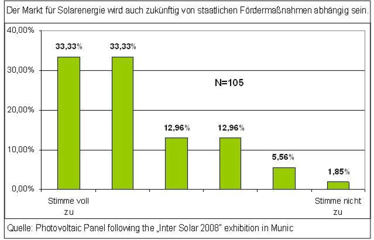 Ein weiterer Schwachpunkt liegt in der Abhängigkeit von staatlichen Fördermaßnahmen. Da Solarstrom im Vergleich zu konventionellem Strom noch nicht wettbewerbsfähig produziert werden kann, ist die Solarbranche national wie auch international weiterhin stark auf Subventionszahlungen angewiesen. Ergebnisse einer Studie, die im Rahmen der „All Energy“ Messe in Aberdeen (Mai 2008) durchgeführt wurde, zeigen, dass mehr als 70 Prozent der Befragten davon ausgehen, dass in absehbarer Zukunft keine Wirkungsgradparität mit konventionellen Techniken und somit eine Unabhängigkeit von Förderung erreicht werden. Ein nahezu gleiches Ergebnis lieferte die Befragung von Brancheninsidern auf Europas größter Fachmesse für Solartechnik, „Intersolar“ in München (Juni 2008), bei der die Zustimmung ebenfalls mehr als 75 Prozent betrug. Die dargestellte relativ hohe Abhängigkeit von staatlicher Unterstützung birgt enorme Risiken für die Zukunft des PV-Sektors.