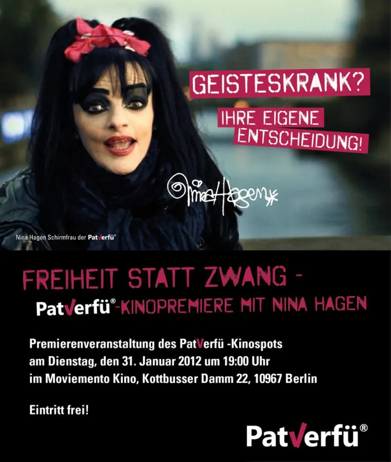 Das Patientenverfügungsgesetz wurde vor zwei Jahren mit einer breiten Mehrheit im Bundestag verabschiedet. Seither gilt: Der Patientenwille ist bei allen medizinischen Entscheidungen als rechtsverbindlich zu betrachten. Das bedeutet, niemand darf hierzulande entmündigt, gegen seinen Willen in eine geschlossene Psychiatrie eingewiesen und zwangsbehandelt werden. Schutz vor dem Verbrechen Zwangspsychiatrie gibt es trotz Gesetz dennoch weder von der Polizei noch von Angehörigen. Helfen kann nur eine schlaue Patientenverfügung, die PatVerfü®. Das sollte unbedingt jeder wissen, findet Nina Hagen, die nicht nur in dem Social-Spot mitgewirkt hat, sondern auch die Schirmfrauschaft für die PatVerfü übernimmt: