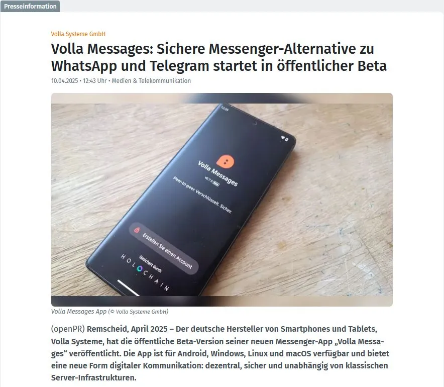 Success Story: Der deutsche Hersteller von Smartphones und Tablets, Volla Systeme aus Remscheid, erzielte mit der auf openPR veröffentlichten Pressemitteilung zu seiner sicheren Messenger-App „Volla Messages“ eine bemerkenswerte Reichweite und Medienresonanz. Die Veröffentlichung auf openPR verzeichnete über 9.000 Zugriffe, wurde an 16 weitere PR-Portale verbreitet und diente als Quelle für weitere Berichte in themen- und branchenrelevanten Medien, u. a. in CHIP, heise online und PC Welt.