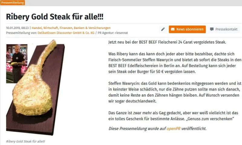 Success Story: Ein Berliner Metzger bietet Goldsteaks à la Ribéry an. Er veröffentlicht dazu eine Pressemitteilung auf openPR.de und verschickt sie über den Fachverteiler. Die Meldung erreicht über 1.800 Zugriffe direkt auf openPR. In kurzer Zeit greifen über 15 weitere regionale Tageszeitungen und überregionale Medien die News auf und veröffentlichen sie deutschlandweit – von der Ostsee bis in den Süden.