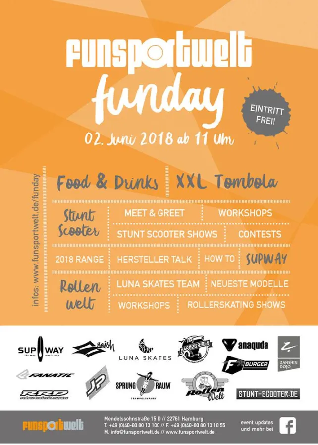 Aufgepasst liebe Funsportler, unser einzigartiger Erlebnistag der Funsportwelt geht dieses Jahr in die nächste Runde - und da darfst du natürlich nicht fehlen! Unser diesjähriger FUNDAY findet am 13. Mai 2017 von 10.00 - 18.00 Uhr bei uns in und rund um die Funsportwelt in Hamburg-Bahrenfeld statt. Von beliebten Stunt-Scootern, hochwertigen Inflatable …