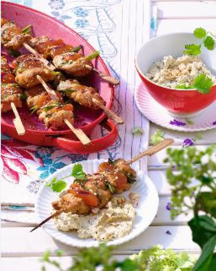4. Koriander hacken und unterrühren. Lauchzwiebeln putzen, waschen und in Stücke schneiden. Holzspieße 20 Minuten in Wasser einweichen, ölen und die Hähnchenbruststreifen, Lauchzwiebeln und Aprikosen im Wechsel auf die Spieße ziehen.