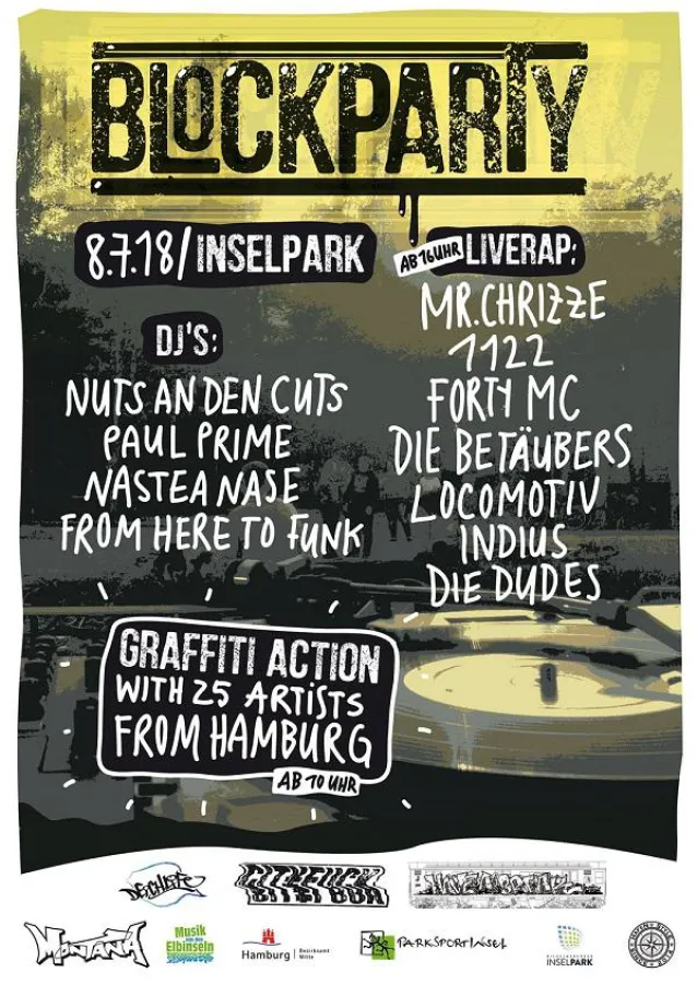 In der Tradition des HipHop wird Draußen und mit der Nachbarschaft gefeiert. Dazu gibt´s Beats vom Plattenteller, Live Rap und 25 Sprüher werden die Schallschutzwand entlang des Skateparks mit Farbe verschönern.