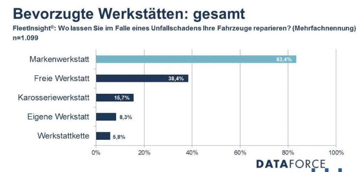 Als Grund für die häufige Nutzung der Vertragswerkstätten könnte herangezogen werden, dass Flottenverantwortliche vor allem schnellere Abwicklungen und Reparaturen bevorzugen. Erst auf Platz zwei folgen günstigere Preise. Dafür spricht auch, dass sich nur ein Drittel aller Fuhrparkleiter Vergleichsangebote zur Reparatur einholen. Überraschenderweise sind bei kleinen Fuhrparks, die eigentlich in der Auswahl der Werkstatt flexibler sein sollten, Vergleichsangebote am wenigsten gefragt.