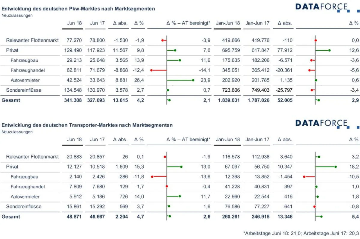 Der deutsche Pkw Markt erzielte im Juni 2018 ein robustes Wachstum von 4,2 Prozent im Vergleich zum Vorjahresmonat. Nach Berücksichtigung von Effekten, die aus Differenzen der Arbeitstage resul-tieren, beläuft sich dieser Anstieg immer noch auf 2,1 Prozent.