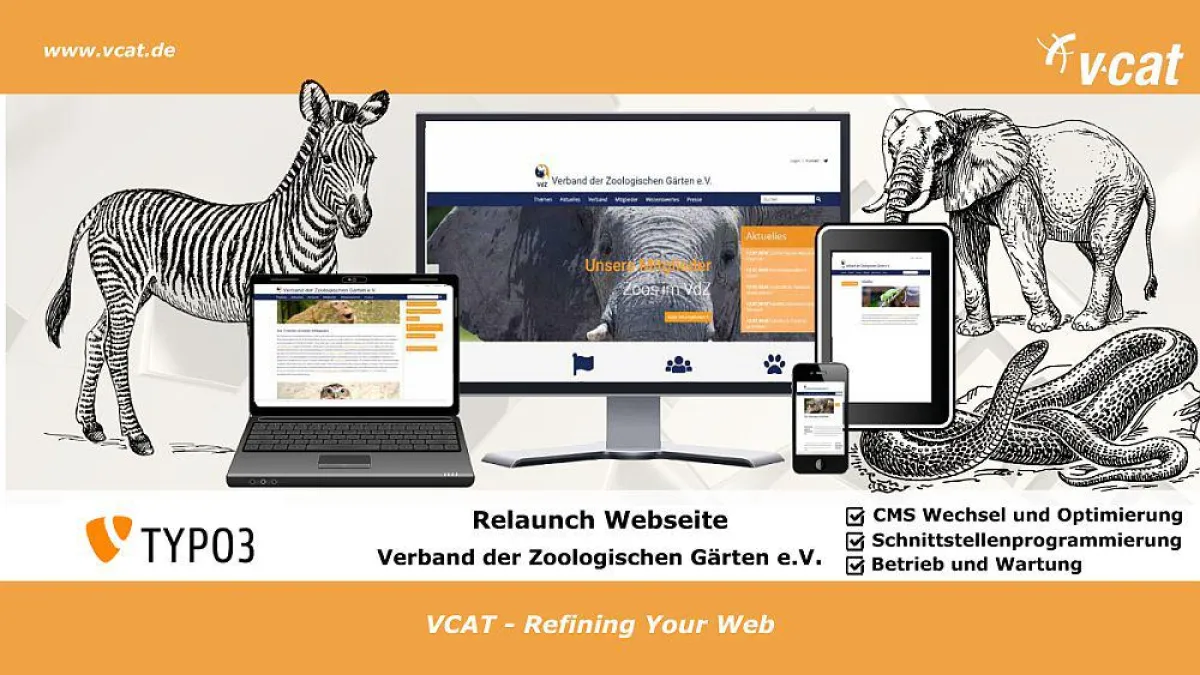 (openPR) Der neue Internetauftritt des Verbandes der Zoologischen Gärten e.V. ist durch die Internetagentur VCAT Consulting GmbH aus Potsdam, entwickelt und programmiert worden. Das Resultat ist eine umfangreiche und moderne Webseite für den Verband. Diese wurde im Responsive Design auf Basis des Content-Management-Systems TYPO3 gestaltet, um eine optimale Darstellung auf unterschiedlichen Endgeräten zu ermöglichen.