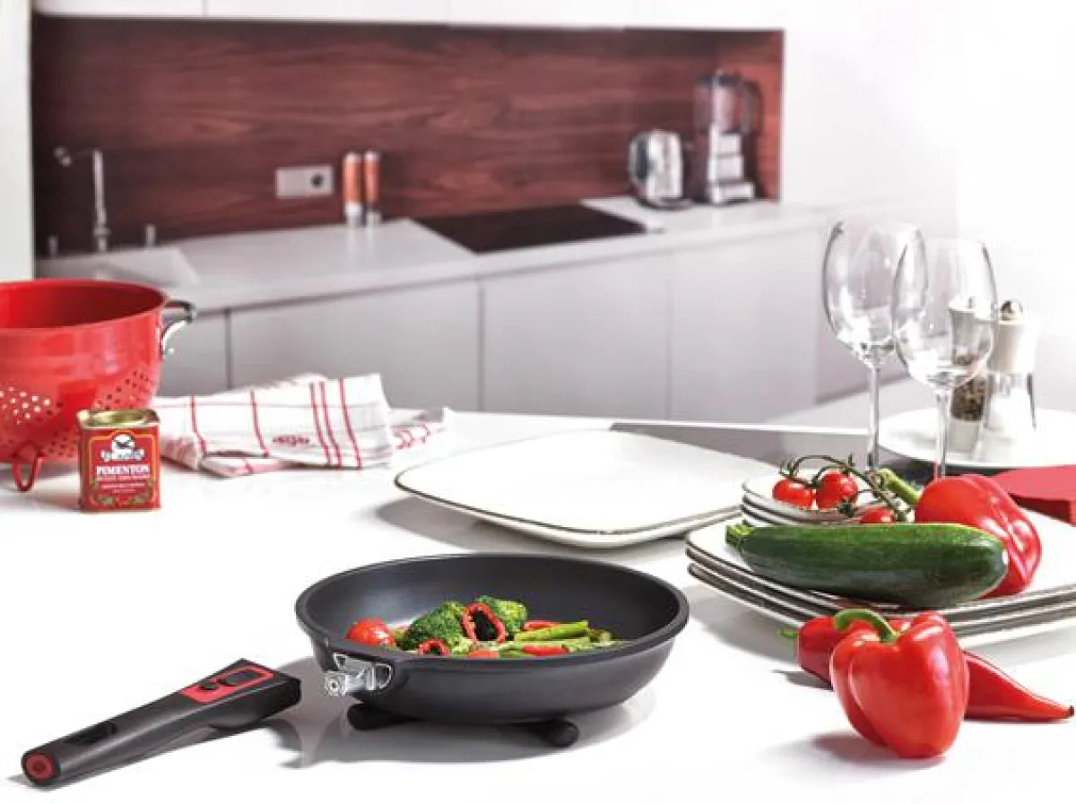 In jeder noch so großen Küche ist Platz ein wertvolles Gut – und der sollte optimal genutzt werden, in Schubladen ebenso wie in Schränken. Mit einer Stielpfanne ist das gar nicht so einfach. Kann man den Griff aber abnehmen, ist eine solche Pfanne schon sehr viel leichter und platzsparender zu verstauen. Schulte-Ufer hat das erkannt und präsentiert mit Switch eine Pfanne mit 1-2-click™-System. Das ausgeklügelte System ermöglicht es, den Pfannengriff einfach und bequem von der Pfanne zu lösen – und wieder problemlos an der Pfanne zu befestigen.