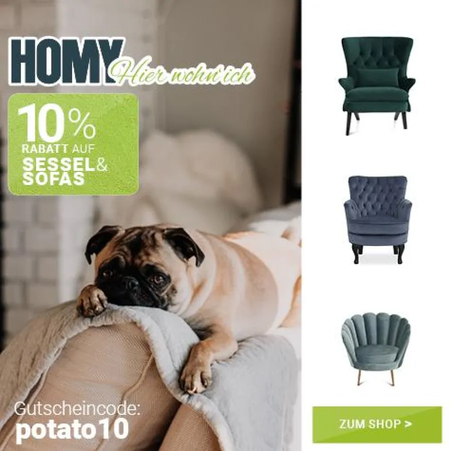 Bis zum 5. September 2018 schenkt Ihnen der HOMY-Onlineshop 10 Prozent Rabatt auf alle hochwertigen und bequemen Sofas und Sessel. Nutzen Sie für den Rabatt den Code „potato10“. Der Mindestbestellwert liegt bei 100 €.
