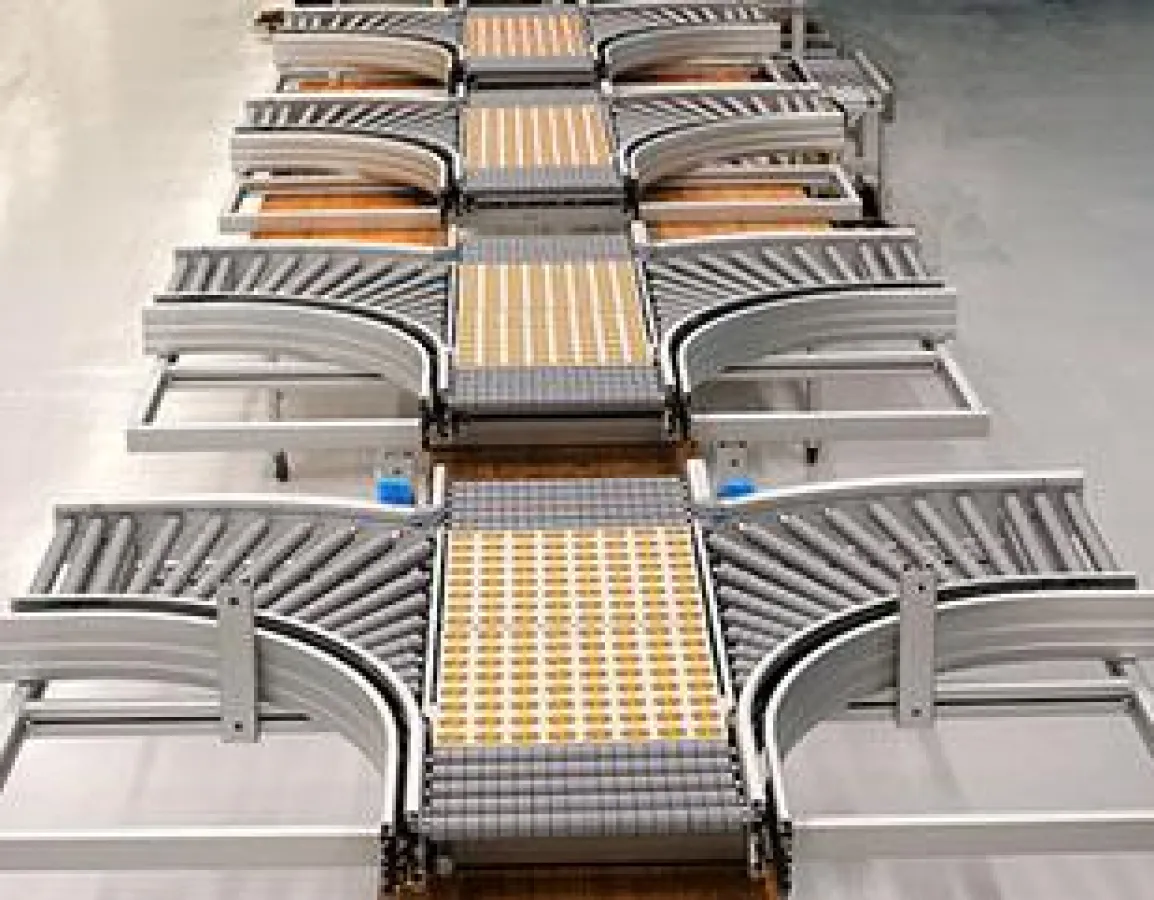Eine clevere Lösung repräsentiert diese Anwendung. Anstatt eine lange Reihe von Rollen diagonal zu installieren, was kompliziert und teuer zu realisieren ist, wird das Problem durch diese OTU-Bausteine gelöst. In diesem Fall ist die Richtung festgesetzt. Die Anwendung wird vor Barcodelesern verwendet, wenn Boxen oder Kartons unterschiedliche Abmessungen haben.