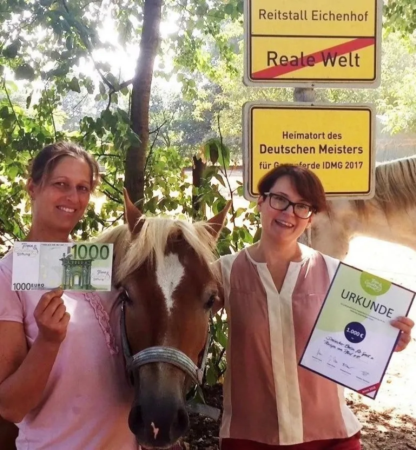 Michaela Sierra Lois, Botschafterin der Town & Country Stiftung, übergab den symbolischen Spendenscheck und sagte über das Projekt: „Das Pferd wird beim Reitsport zu einem wichtigen Freund und Vertrauten. Deshalb freue ich mich sehr, dass der Verein nicht nur gesunden Personen den Umgang mit den Tieren ermöglicht, sondern sich besonders für die Unterstützung von Kindern und Jugendlichen mit speziellem Förderungsbedarf engagiert.“