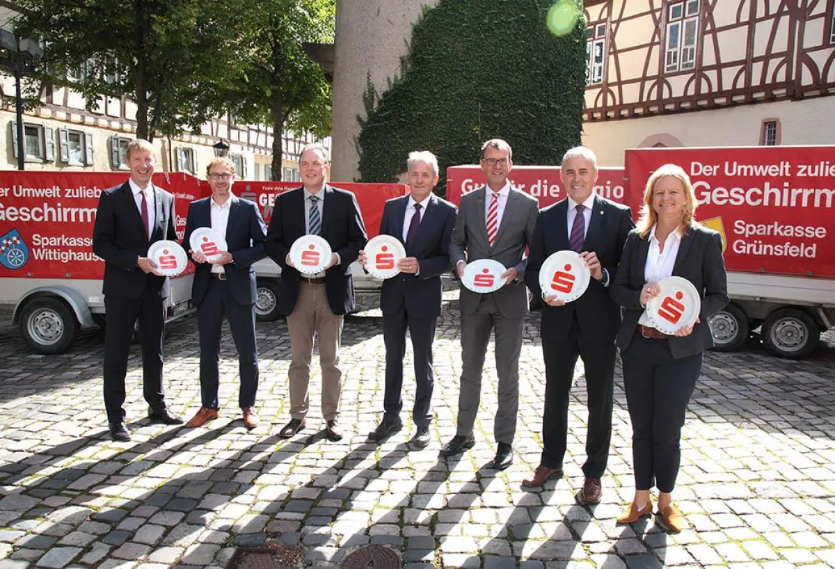 Main-Tauber-Kreis. „Müllvermeidung durch mobiles Mehrweggeschirr“ – so lautete vor knapp 30 Jahren die große Umweltinitiative der Sparkasse, bei der insgesamt 13 Trägergemeinden mit voll ausgestatteten Geschirrmobilen versorgt wurden. Seither ist die Nachfrage zur Anmietung der Geschirrmobile von unterschiedlichsten Vereinen und Organisationen, aber auch von Privatpersonen über die jeweilige Gemeinde unverändert stark. Die Geschirrmobile haben sich als fester Bestandteil für öffentliche und private Veranstaltungen und Feierlichkeiten im Geschäftsgebiet der Sparkasse etabliert. „Rückblickend eine Initiative der Sparkasse mit unschätzbarem Beitrag zum Umweltschutz und enormen Weitblick“, so Sparkassendirektor Peter Vogel. Durch die hohe Frequentierung der Geschirrmobile war das Porzellan auf Grund von Bruch nicht mehr komplett bzw. stark abgenutzt. Die Sparkasse Tauberfranken hat sich daher dazu entschieden, sukzessive alle Geschirrmobile mit neuem hochwertigen Porzellan, das besondere Kriterien wie beispielsweise eine extrem hohe Kantenstoßfestigkeit erfüllt sowie über einen speziellen Überdrucklack verfügt, neu zu bestücken. Hierfür werden insgesamt rund 130.000 Euro aus dem PS-Zweckertrag der Sparkasse investiert. In einer ersten Tranche wurden die Städte Tauberbischofsheim, Grünsfeld, Lauda-Königshofen und Freudenberg sowie die Gemeinden Großrinderfeld und Wittighausen mit neuem Geschirr ausgestattet. Weitere folgen. Die Bürgermeister zeigten sich sehr erfreut über das Engagement der Sparkasse verbunden mit einem erneuten nachhaltigen Beitrag zur Abfallvermeidung und nahmen die Sachspende stellvertretend gerne entgegen. Auf ebenfalls sehr positive Resonanz traf die Erweiterung der Grundausstattung mit großen Henkelbechern sowie die Anschaffung neuer Transportboxen. Sichtlich stolz betonte Sparkassendirektor Peter Vogel, dass er die Investition als Beitrag für das Gemeinwohl aller Menschen im Geschäftsgebiet seiner Sparkasse sieht. „Umweltschutz geht uns alle an“, betonte Peter Vogel. „Allein die Müllberge, die durch die Nutzung des Mehrweggeschirrs der Mobile in den vergangenen Jahren vermieden werden konnten, lassen uns positiv in die Zukunft schauen und bestärken uns, uns weiterhin für eine intakte Umwelt und den aktiven Umweltschutz zu engagieren“, so Vogel weiter. Das von den Städten und Gemeinden im Austausch an die Sparkasse zurückgegebene und noch brauchbare Geschirr wird weiterhin für wohltätige Zwecke sinnvoll verwendet.