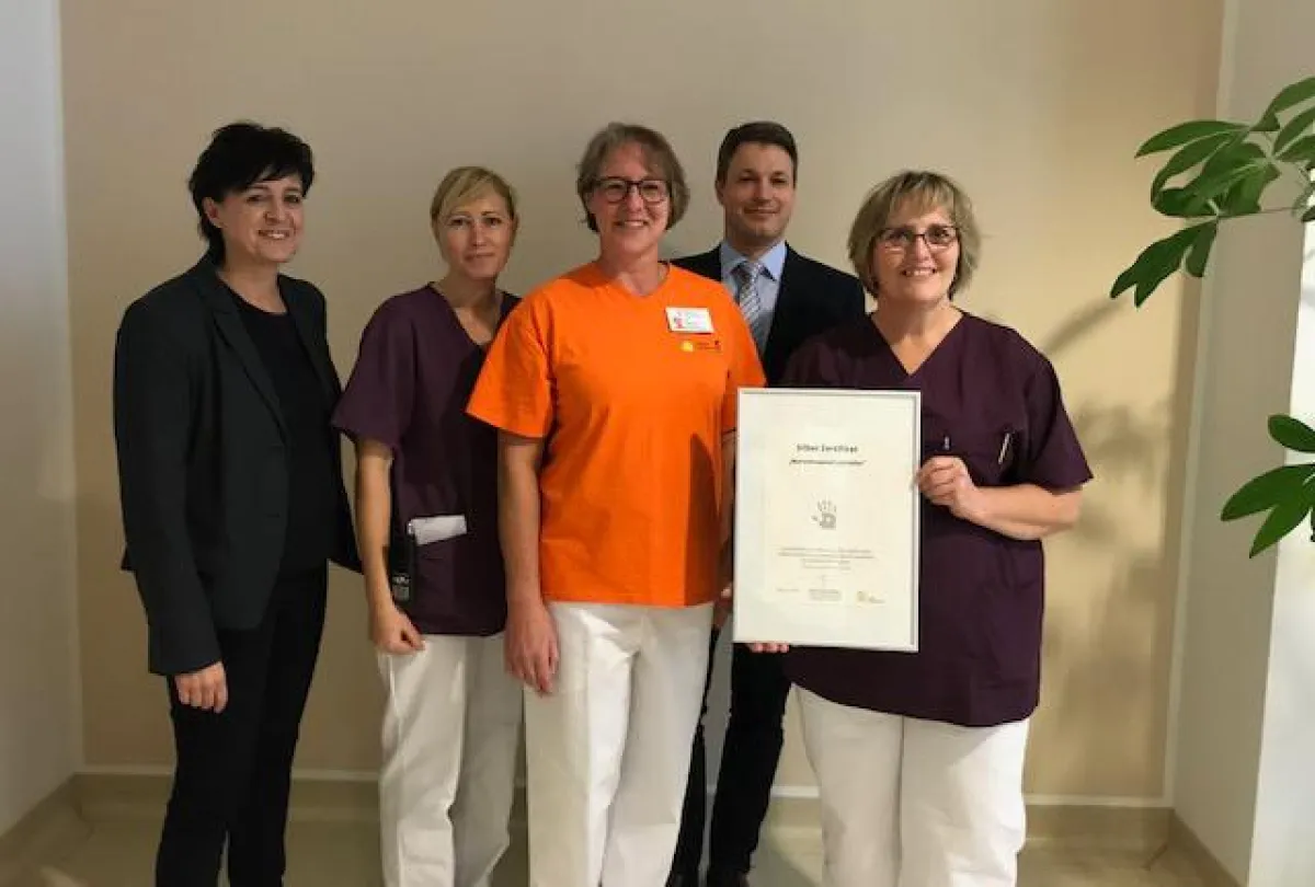Dass das Thema Händehygiene im Marienhospital Letmathe höchste Priorität genießt, zeigt auch die erst kürzlich wieder erfolgte Auszeichnung mit dem Silber-Zertifikat der "Aktion Saubere Hände". Um erfolgreich zertifiziert zu werden, müssen die Einrichtungen unter anderem ihre Stationen umfassend mit Desinfektionsmittelspendern ausstatten. Auch muss eine bestimmte Verbrauchsmenge von Desinfektionsmitteln nachgewiesen werden. Für die Umsetzung dieser und weiterer Maßnahmen, die zur Auszeichnung führten, sorgte auch hier das Team der Krankenhaushygiene in Zusammenarbeit mit den hygienebeauftragten Pflegekräften auf den Stationen und den hygienebeauftragten Ärzten.