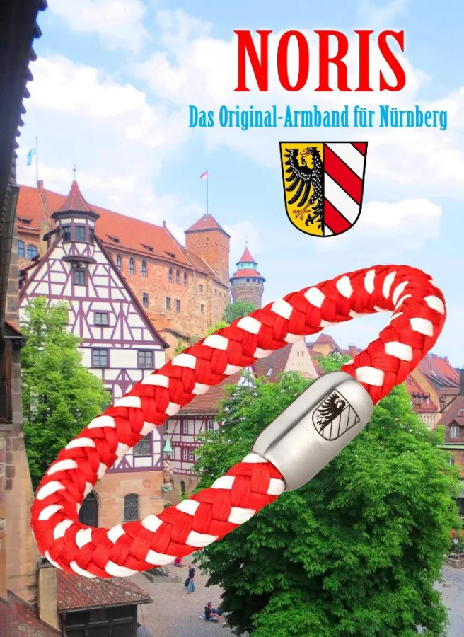 “NORIS” - das ist 100% Nürnberg, 100% Lokalcolorit. Ein geflochtenes Textilarmband im modischen Segeltau-Design, das in den fränkischen Farben erscheint und zudem das kleine Nürnberger Stadtwappen auf seinem Magnetverschluss aus Edelstahl trägt. Es ist robust, wasserfest und in nachhaltiger und geprüfter Markenqualität gefertigt (Hanse Control Hamb…