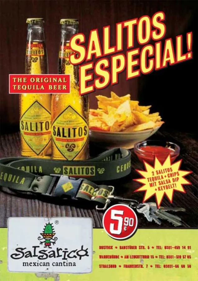 Zum „Precio Especial“ gibt es für Fans des Latino-Lifestyles das „SALITOS Especial“: zwei „SALITOS Tequila Flavoured Beer“ sowie Nachos mit Dip und ein exklusives SALITOS Keybelt gibt es schon für 5,90 Euro. Bei Mariachi-Musik wird mit SALITOS gefeiert, bis die Dielen krachen!