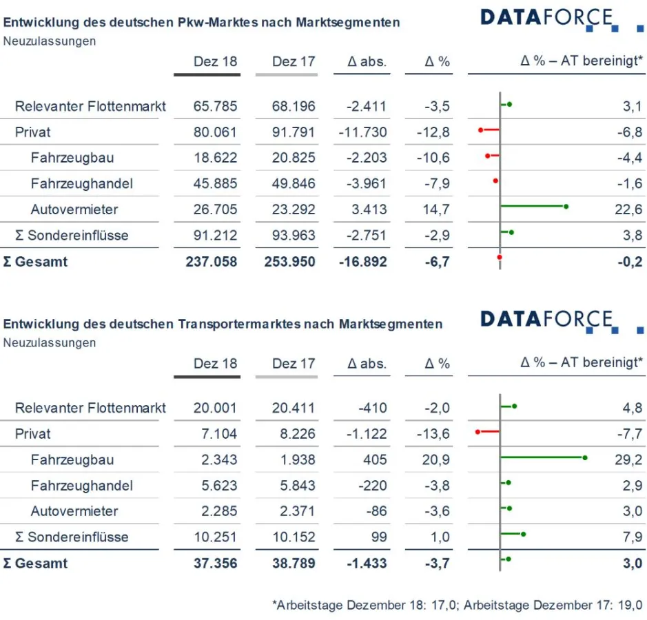 Seit September 2018 haben Lieferschwierigkeiten und Homologationsverzögerungen infolge der WLTP-Einführung den deutschen Automobilmarkt im Griff. Auch im Dezember waren entsprechende Folgen noch spürbar, denn insgesamt gab der deutsche Pkw-Markt um 6,7 Prozent nach, wobei auch die meisten Marktsegmente diesem Trend folgten. Dabei musste der Privatmarkt den deutlichsten Rückgang um 12,8 Prozent hinnehmen.