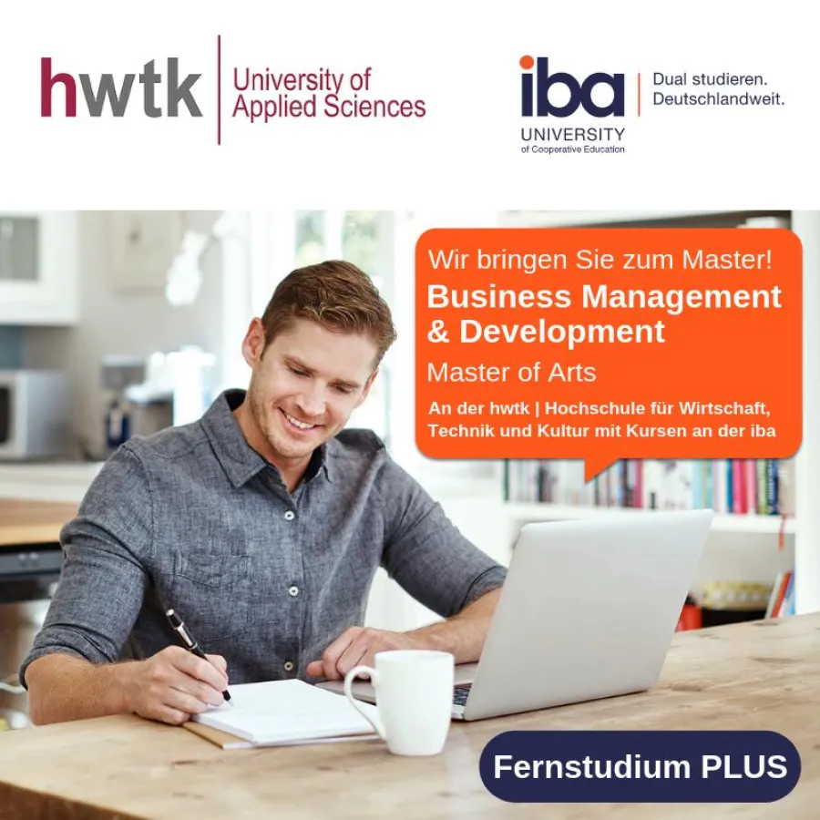 (openPR) Sie möchten einen Masterabschluss, ohne dafür Ihren Job zu unterbrechen? Die iba hilft Ihnen dabei! Die hwtk | Hochschule für Wirtschaft, Technik und Kultur bietet Ihnen den viersemestrigen Master of Arts ‚Business Management & Development (M.A.)‘ als Fernstudium und mit persönlicher Betreuung an einem iba Studienort an. Studieren Sie, wann immer Sie Zeit haben und dort, wo Sie am besten lernen können, ganz einfach neben Ihrem Beruf.