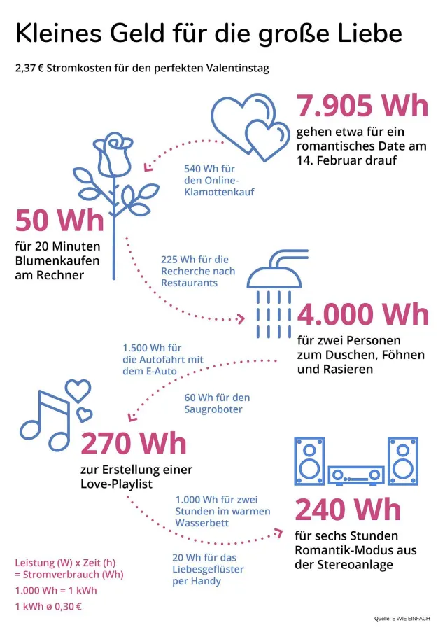 Mit Blick auf den aktuellen durchschnittlichen Preis einer Kilowattstunde in Deutschland, 30 Cent, kostet eine romantische Verabredung zum Valentinstag demnach etwa 2,37 Euro. Die Berechnung erfolgte auf der Basis von Recherchen und „Flurumfragen“ beim Energieanbieter E wie einfach mit Sitz in Köln.