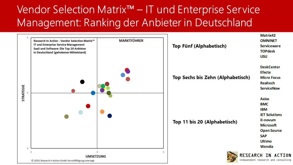 (openPR) Research In Action GmbH veröffentlicht die neuste Vendor Selection Matrix™ - IT und Enterprise Service Management SaaS und Software: Die Top 20 Anbieter für den gehobenen Mittelstand in Deutschland 2019.