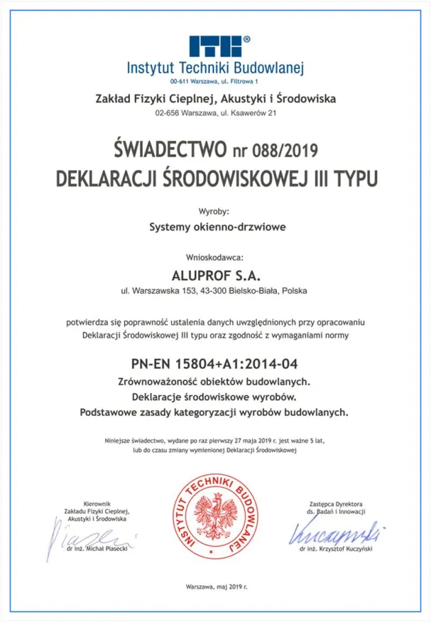 (openPR) Bielitz/Polen, den 11. Juni 2019 – Das Institut für Bautechnik (ITB = Instytut Techniki Budowlanej) – ein Forschungsbetrieb unter der Aufsicht des Ministeriums für Investitionen und Entwicklung – hat ALUPROF, einem der führenden Hersteller von Aluminiumsystemen, die Umwelt-Produktdeklaration (EPD = Enviromental Product Declaration) vom Typ III gemäß den Normen ISO 14025 und EN 15804 ausgestellt. Sie ist, wie alle EPDs, fünf Jahre lang gültig und beschreibt neben dem Energie- und Ressourcenverbrauch der Fassaden-, Fenster- und Türsysteme des Herstellers auch den Emissionseintrag der Produkte in die Umwelt – und das über den gesamten Produkt-Lebenszyklus, i.e. von Rohstoffgewinnung über Herstellung und Nutzung bis zur Entsorgung/Recycling. Das Zertifikat steht auf der Seite www.aluprof.eu zum Download bereit und dient als transparente, unabhängige und nachvollziehbare Quelle für Bauherren und Architekten, die in der Planungsphase verschiedene Modelle miteinander vergleichen. Außerdem fungieren die Informationen als Grundlage für eine Nachhaltigkeitsbewertung von Bauwerken.