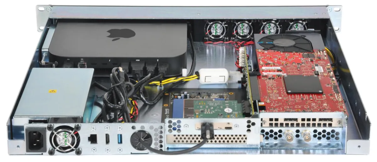 Mit einem Mac mini, der im xMac mini Server installiert ist, kann dieser die Leistung professioneller Audio-Schnittstellenkarten wie der Avid® Pro Tools | HDX, Pro-Videoerfassungs- und Transcodierungskarten sowie SAS- und SATA-HBA-, Fibre Channel-, 10-Gb-Ethernet- und RAID-Controller-PCIe-Karten nutzen und so einen kompletten Video-/Audio-Arbeitsplatzersatz erschaffen. Der xMac mini Server ist in einem Rack montiert und ermöglicht daher auch problemlose Mobilität. Zudem ist dieser von einem robustes Stahlgehäuse umgeben und verwendet feste Gummikissen, um den Computer während des Transports an seinem Platz zu halten.