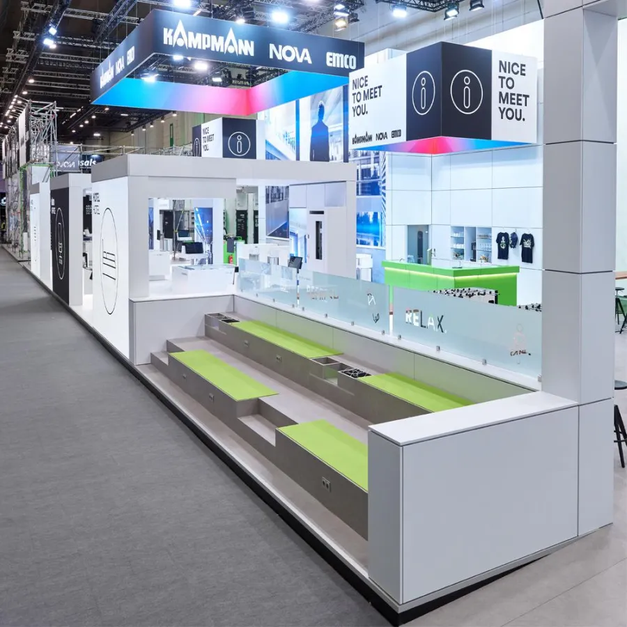 Das Standkonzept der Lingener Innenarchitektin Uta Volkmann setzte ISINGERMERZ bautechnisch um; allein für KAMPMANNs wichtigste nationale Produktschau ISH nun schon der vierte bedeutende Auftrag in Folge. Aufgeräumt übersichtlich und thematisch strukturiert demonstrierten die 845 qm Standfläche ein breites innovatives Produktportfolio an klimatechnischen Lösungen, stets anwendungstypisch in eigens dafür konstruierte Boden-, Wand- oder Deckensituationen architektonisch eingebettet.