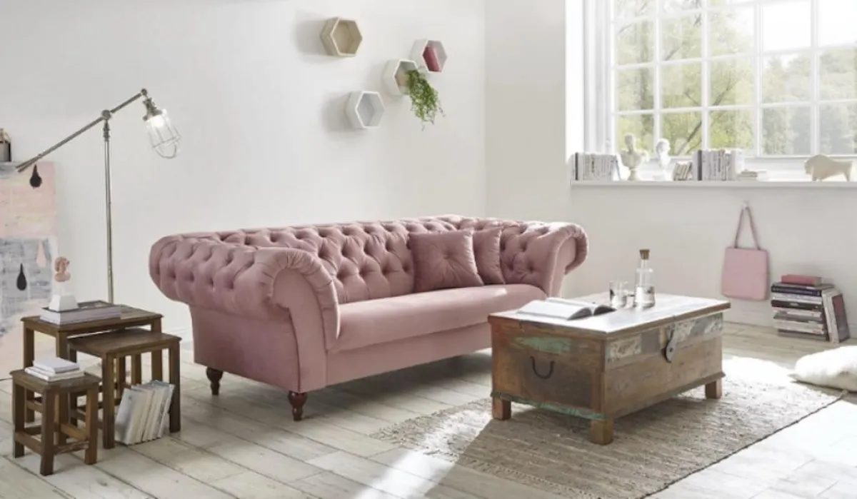 Möbel aus hochwertigem Massivholz schaffen eine zeitlose, neutrale Basis im Wohnbereich. Einzigartig wird dieses natürliche Ambiente durch den Kontrast mit einer besonderen Farbe. Dabei ist die Auswahl groß: Optimistisches Rosa, kühles Blau, entspanntes Grün oder anregendes Rot? Jede Farbe bringt eine ganz eigene Atmosphäre ins Zuhause. Und auch bei den Stilrichtungen finden sich zahlreiche Varianten. Dadurch entstehen aufregende Mischungen: So wirkt der klassische Brit-Chic des Chesterfield-Stils bei Sofa Kenema modisch cool durch die Polster in Rosé oder Grün. Mit frischem Used-Look aus gebrauchten Jeansstoffen sorgt auch das Chesterfield Sofa im Denim-Style für ein entspanntes Wohngefühl.