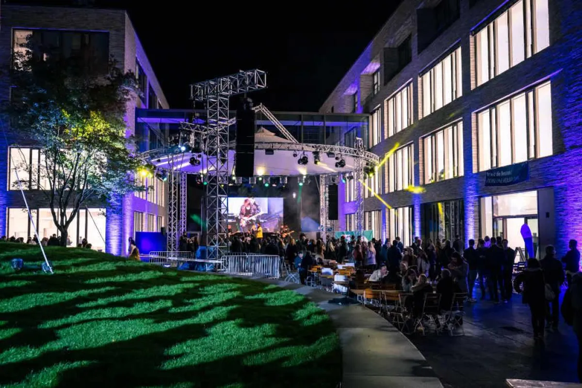 Außerdem kamen die Showbühne (8 x 6 m) auf dem neuen Campus-Plaza und deren technische Ausstattung ebenfalls aus dem Hause dlp motive. Hierbei wurde das begrenzte Platzangebot optimal genutzt und eine Podestfläche über einem kleinen Bestandsbau realisiert. Bühnenrückseitig installierte man ein Layhergerüst, in welches eine LED-Videowand integriert war.