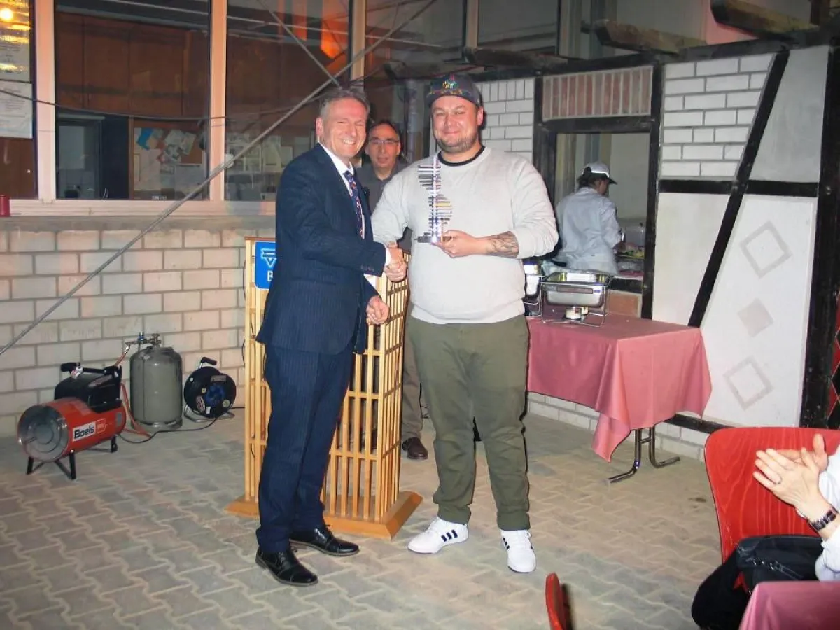 Den diesjährigen Preis, eine Statue in Form einer Wendeltreppe, gefertigt in der CJD Metallwerkstatt, erhielt die Bau Firma Heyer Köln, Umbau-Renovierung-Sanierungskonzepte. Der Preis wurde von Inhaber Thorsten Wilhelm Heyer entgegen genommen. In seiner Laudatio erklärte Axel Höfel, Veranstaltungsmanager und Pädagoge im CJD Frechen, Thorsten Heyer sei ein gestandener Mann mit rauer Schale, aber er zeichne sich aus durch einen sehr sozialen Kern, wie er kaum einen Menschen erlebt habe, der im Hochbau arbeitet. Heyer habe erkannt, dass das höchste Kapital eines Unternehmens gute und zufriedene Mitarbeitende seien. Praktikumsbetriebe, wie die Firma Heyer seien für das CJD Frechen wichtig, da dort die jungen Menschen am Kunden lernen und auch das, was in den Fachbetrieben erarbeitet wird.