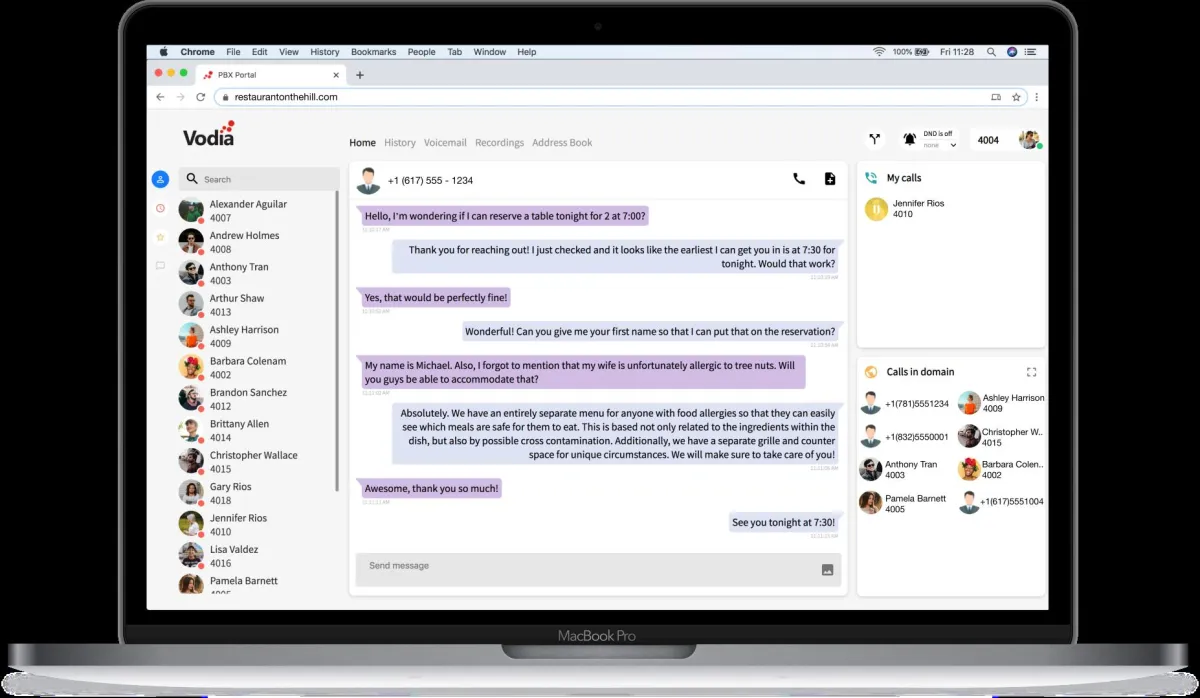 Für die Telefonanlage ergeben sich dadurch neue Möglichkeiten. Dadurch, dass das Softphone auch hier Einzug hält, wird es nun möglich, SMS auch im Namen der Firma zu empfangen und zu senden – auch auf dem privaten Handy. Es wird nun auch möglich, dass mehrere Mitarbeiter SMS empfangen und sogar den Chat von einem Mitarbeiter zum anderen übergeben können. Eingehende SMS können beispielsweise auf mehrere Callcenteragenten verteilt werden, je nachdem, wer gerade eingeloggt ist. Das funktioniert so ähnlich wie das Verteilen eingehender Anrufe. Die SMS-Historie mit dem Kunden wird nicht auf dem Handy gespeichert, sondern in der Telefonanlage. Sollte mal einer der Mitarbeiter gehen, übernimmt diese ein anderer Mitarbeiter. MMS können auch verschickt werden. So könnten zum Beispiel Bilder von dem Tisch im Restaurant verschickt werden, falls der Gast den vorher schon mal sehen will. Für den Kunden läuft das alles unter der Nummer der Firma. Wenn die Konversation mit dem Kunden zu kompliziert wird, können Kunde oder auch der Mitarbeiter auf die Audioverbindung wechseln, so dass die Interaktion so effizient und angenehm wie möglich ist. Schließlich ist es ja immer noch eine Telefonanlage.