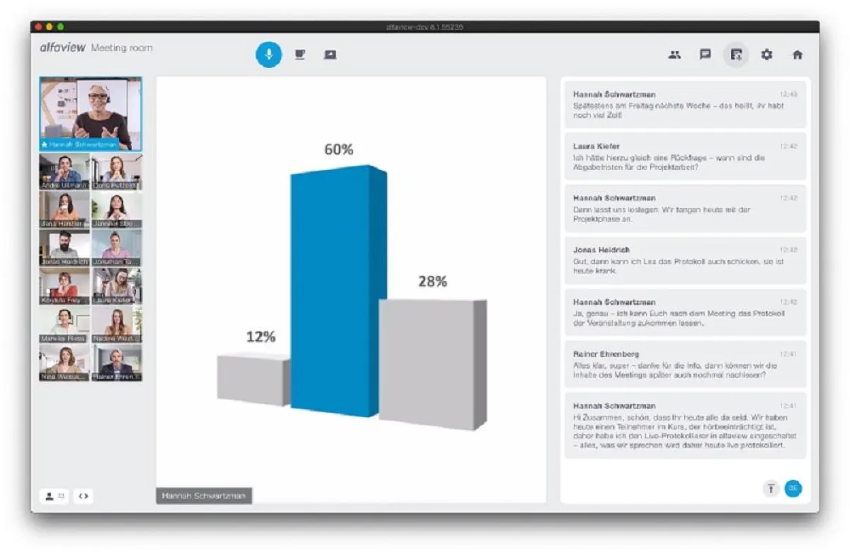 Der neue virtuelle Klassenraum ist eine Revolution in der Bildungslandschaft und eine Chance für alle Menschen mit Hörbeeinträchtigung oder Sprachbarriere. Seminare und Meetings können nun in Echtzeit protokolliert sowie in nahezu alle Sprachen der Welt live übersetzt werden. Über alfaview kann damit ein flächendeckendes, barrierefreies und inklusives Bildungsangebot zur Verfügung gestellt werden. Menschen mit Hörbeeinträchtigung sowie Personen aus unterschiedlichen Herkunftsländern wird mit alfaview erstmals ein barrierefreier Zugang zu digitaler Bildung ermöglicht.