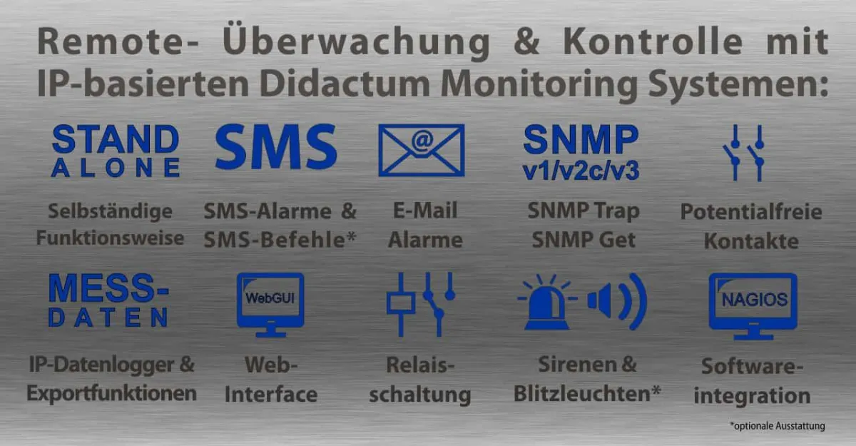 Die Firma Didactum Security GmbH mit Sitz in Amelsbüren, bietet ein umfassendes Sortiment an TCP/IP basierten Datenloggern an. Bereits das Einstiegsmodell, das Monitoring System 50, unterstützt den Anschluss von bis zu 2 intelligenten Sensoren für die physikalische Umgebungsüberwachung. Ein präziser Temperatursensor ist bereits im Lieferumfang enthalten. Im Webinterface des Datenloggers kann dieser Sensor, unter Zuhilfenahme eines geeichten Thermometers, nachträglich kalibriert werden.