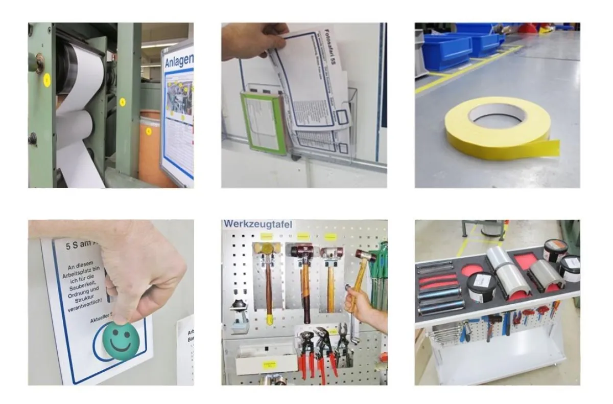 Bereits mit solchen einfachen Hilfsmitteln kann die Umsetzung der 5S-Methode in Ihrem Unternehmen erheblich erleichtert werden. Diese Hilfestellungen erleichtern den Überblick und helfen bei der dauerhaften Standardisierung Ihrer neuen Ordnungsstruktur.