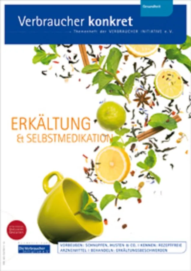Erkältungen sind beliebte Anwendungsgebiete für die Behandlung in Eigenregie. Was dabei zu beachten ist, verrät das Themenheft „Erkältung & Selbstmedikation“ der VERBRAUCHER INITIATIVE. Die 16-seitige Broschüre gibt außerdem Tipps zur Vorbeugung von Schnupfen & Co. Sie kann für 2,00 Euro (zzgl. Versand) unter www.verbraucher.com bestellt oder heruntergeladen werden.