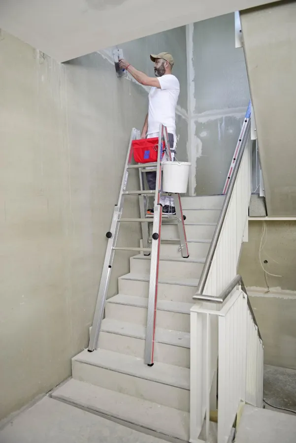 Einen sicheren Stand bei Arbeiten auf Treppen oder auf unebenen Untergründen ermöglicht die Treppenstehleiter 4123 mit ihren vier stufenlos höhenverstellbaren Fußverlängerungen. Die kleinste Variante mit 2 x 5 Sprossen erlaubt eine Reichhöhe von 2,77 Metern, die größte Variante mit 2 x 8 Sprossen eine Reichhöhe von 3,55 Metern. Für den äußerst stabilen Stand der Treppenstehleiter sorgen die konische Bauform, die Spreizsicherung mittels hochfester Gurtbänder sowie die patentierte Feststellvorrichtung mit Bremsklötzen.