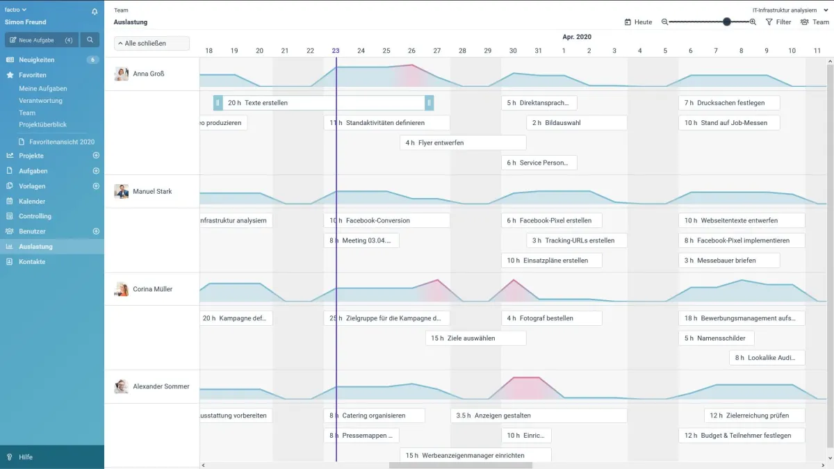 „Ab sofort haben Teamleiter in factro die Möglichkeit, einen grafischen Überblick über die Auslastung ihrer Mitarbeiter zu erhalten. So sehen sie auf einen Blick, welcher Mitarbeiter zu welchem Zeitpunkt mit welchen Aufgaben beschäftigt ist und an welchen Stellen Überlastung oder Freiräume vorliegen“, so Produktmanager Marvin Schuchert.