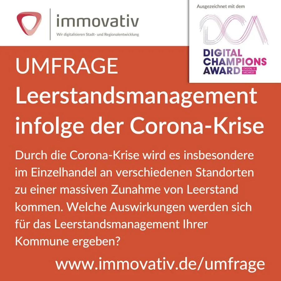 Mit einer aktuellen Umfrage zum Thema möchte die immovativ GmbH einerseits den Status quo des Leerstandsmanagements in deutschen Kommunen vor der Corona-Krise abfragen und zum anderen eine Einschätzung gewinnen, welche Herausforderungen durch die Krise bei den Verwaltungen entstehen und wie sie planen, damit umzugehen.