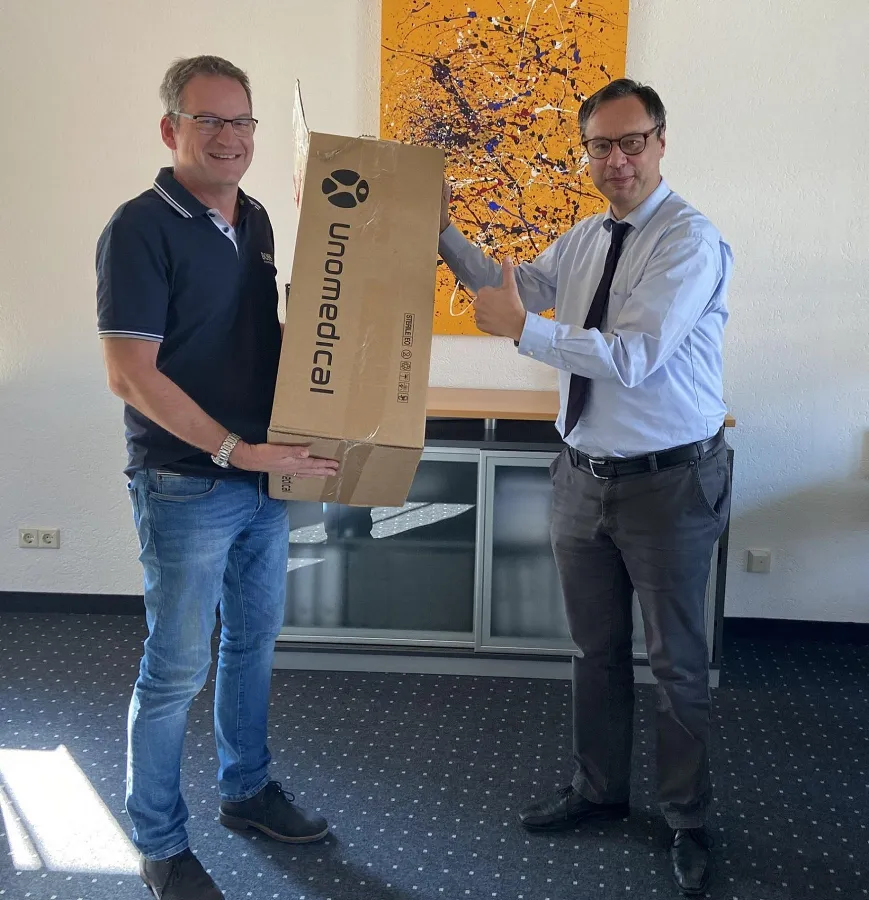 Bildtext: Aufgabe erfolgreich erledigt - Andreas Hilkenbach überreicht Bernd Czerny dringend benötigte Schutzkappen für Fieberthermometer (Foto:CURATIS)