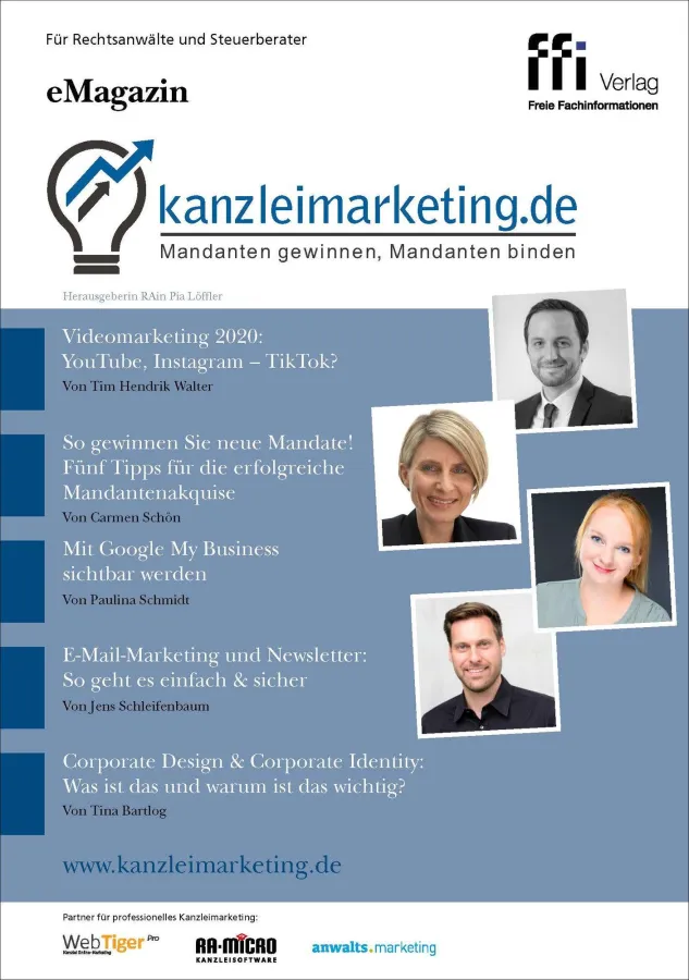 AnwältInnen und SteuerberaterInnen werden in der derzeitigen Coronakrise mit Veränderungen in der Kanzleiorganisation und der Mandantenakquise konfrontiert. Doch Krisen bieten auch die Chance, bestehende Prozesse zu hinterfragen, sich neu aufzustellen und vielleicht sogar seine Kreativität auszuleben. Gerade jetzt sollte die Chance genutzt werden, neue Wege zu gehen. Deswegen berichtet Rechtsanwalt und Youtuber Tim Hendrik Walter im Interview über Videomarketing auf Youtube, Instagram und TikTok. Jens Schleifenbaum erklärt, wie Sie mit professionellen Newsletter-Anbietern erfolgreich E-Mail-Marketing betreiben. Weitere Themen dieser Ausgabe sind außerdem: Corporate Design und Corporate Identity, Google My Business & Kanzleiberaterin Carmen Schöns gibt fünf Tipps für die erfolgreiche Mandantenakquise.