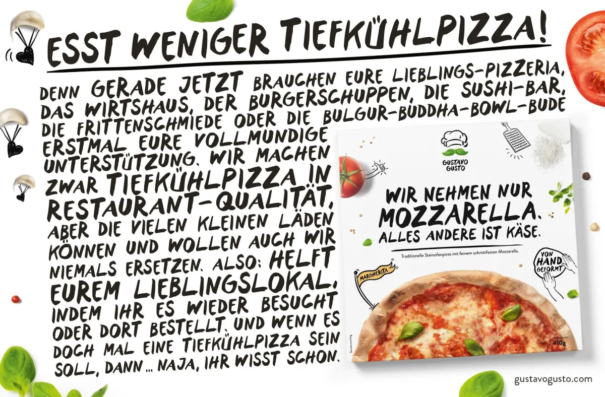 (openPR) Ungewöhnliche Kampagne von Gustavo Gusto: Die junge Tiefkühlpizzamarke fordert „Esst weniger Tiefkühlpizza“ – und wirbt so für lokale Gastronomiebetriebe