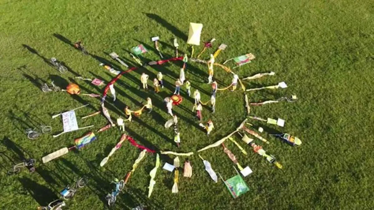 Von einer Drohne aus gesehen bilden Menschen in Nürnberg eine große Sonne.