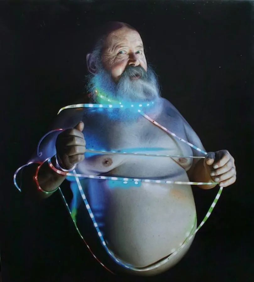 Der in einen ganz neuen Kontext gesetzte Priester zeigt eine neue Interpretation der alten mythologischen Geschichte und schlägt eine Brücke, durch die Darstellung der elektrischen Lichterkette, zur unserer heutigen technologischen Welt.