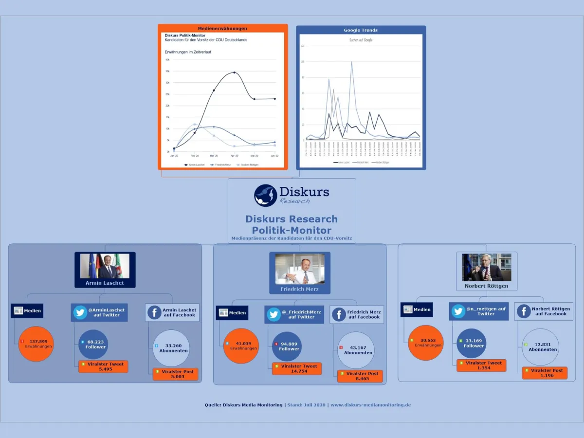Inzwischen hat das Interesse an Informationen im Zusammenhang mit den drei Politikern merklich nachgelassen. Bei den Google-Suchen bewegen sie sich inzwischen auf einem ähnlichen Niveau. Der CDU hat die Corona-Pandemie ein Umfragehoch beschert. Nach der Sonntagsfrage von Infratest dimap ist die CDU seit März von 26 auf 37 Prozent gestiegen. Es bleibt abzuwarten, wie sich die Situation der drei Kandidaten für den CDU-Bundesvorsitz entwickelt, wenn Covid-19 als beherrschendes Thema in den Hintergrund tritt und neue politische Themen die Tagesordnung bestimmen.