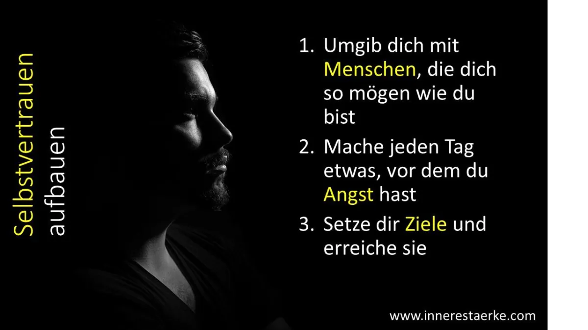 Doch es gibt keinen leichten Weg ins Selbstvertrauen. Oft ist es hart erarbeitet und was die Öffentlichkeit nicht sieht, ist wie viele Schmerzen die Menschen, die jetzt so unverwundbar erscheinen, davor ertragen haben. Auch für das Selbstvertrauen gilt, was jedem Erfolg zugrunde liegt. Man muß bereit sein, dafür zu scheitern. Nur wer viele Male hinfällt, sich dabei eine blutige Nase holt und trotzdem nicht aufgibt, wird eines Tages ein Held sein, den andere nacheifern. Mit Hilfe von drei einfachen Tips kann man sich den nicht leichten Weg aber eventuell etwas verkürzen.