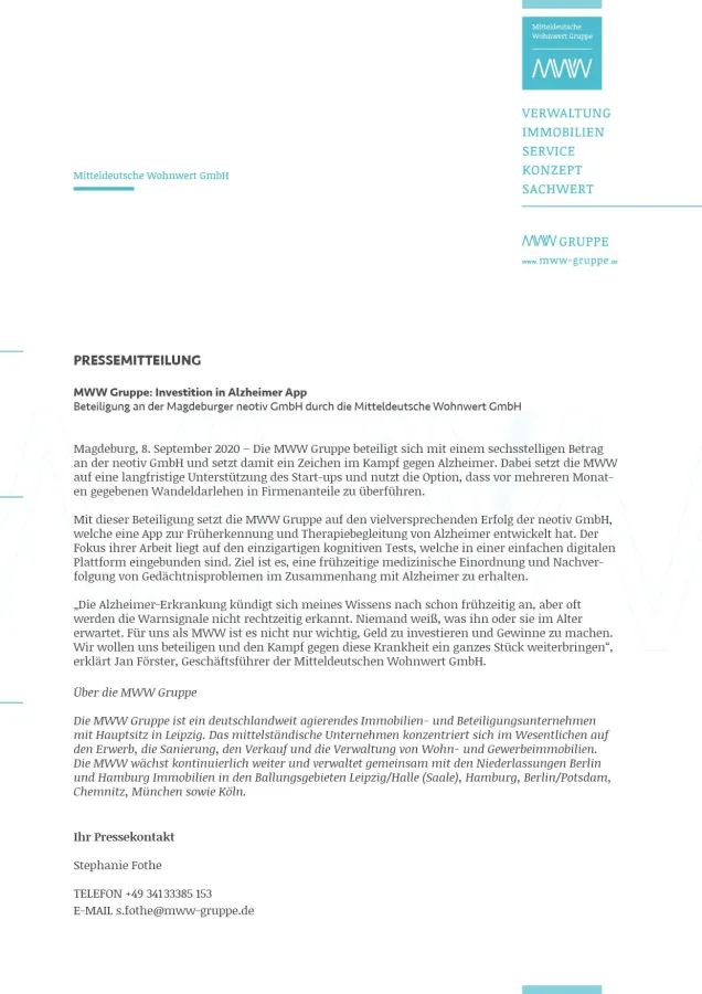 Magdeburg, 8. September 2020 – Die MWW Gruppe beteiligt sich mit einem sechsstelligen Betrag an der neotiv GmbH (Link: https://www.neotiv.com/de) und setzt damit ein Zeichen im Kampf gegen Alzheimer. Dabei setzt die MWW auf eine langfristige Unterstützung des Start-ups und nutzt die Option, dass vor mehreren Monaten gegebenen Wandeldarlehen in Firmenanteile zu überführen.