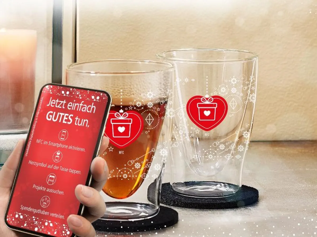 Mehrere besondere Momente der Freude zeichnet die Idee aus: Der praktische Thermobecher aus qualitativ hochwertigem Borosilikatglas ist durch die Doppelwand-Konstruktion mit Isolierwirkung sowohl für den Genuss von kalten als auch von Heißgetränken jeder Art bestens geeignet. Sein Design punktet mit einem modernen Wohlfühl-Dekor und bietet durch den versteckten NFC-Chip eine digitale Innovation. Mit dem hinterlegten Spendencodes in jedem Thermobecher ist ein Spendenbetrag in Höhe von 1 Euro zum Verteilen verknüpft. Ob im Büro, Restaurant oder zu Hause – von jedem Ort aus kann einfach und intuitiv für das Herzensprojekt gespendet werden. Die Spendenplattform „Socialfunders“ sowie die Spendencodes stellt der Kooperationspartner Particulate, Experte für Social Purpose Marketing zur Verfügung. Der Thermobecher mit Spendencode ist mehr als nur ein Geschenk: Eine Botschaft mit Herz für alle, die uns am Herzen liegen.