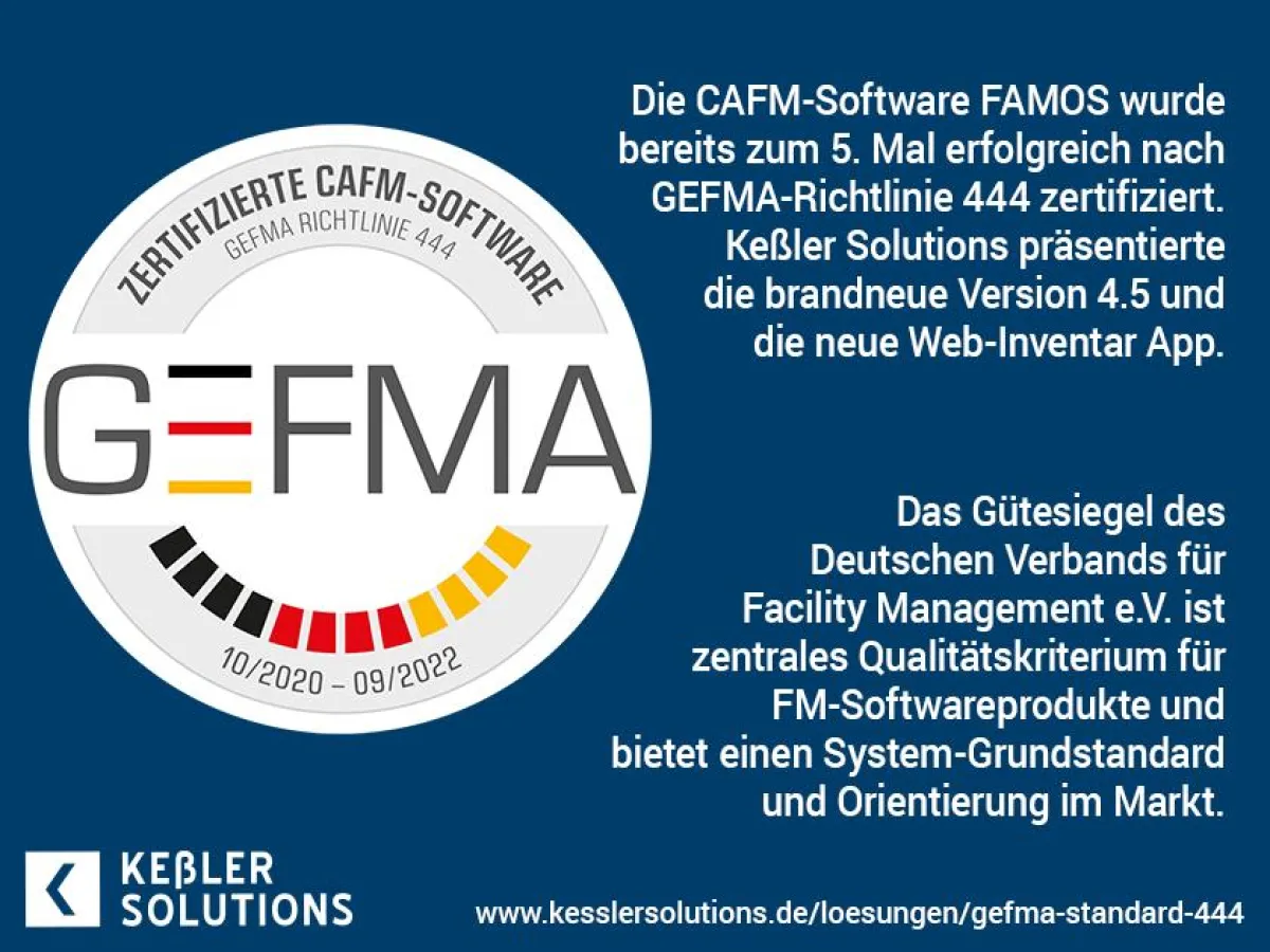 (openPR) Am 23. September wurde die CAFM-Software FAMOS erfolgreich der Zertifizierung nach GEFMA-Richtlinie 444 unterzogen. Keßler Solutions hat in diesem Zusammenhang direkt die brandneue Version 4.5 und die neue Web-Inventar App präsentieren können. Damit wird die CAFM-Lösung bereits zum 5. Mal mit dem Gütesiegel des Deutschen Verbands für Facility Management e.V. ausgezeichnet – ein zentrales Qualitätskriterium für FM-Softwareprodukte, das einen Grundstandard für und damit eine Orientierung im Markt bietet.