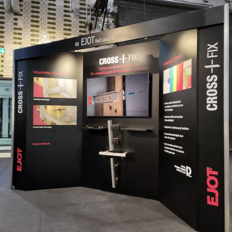 EJOT präsentierte das neue Unterkonstruktionssystem CROSSFIX®, welches maximale Flexibilität und Energieeffizienz miteinander vereint. Für die vorgehängte hinterlüftete Fassade bieten sich damit vollkommen neue Gestaltungsmöglichkeiten.