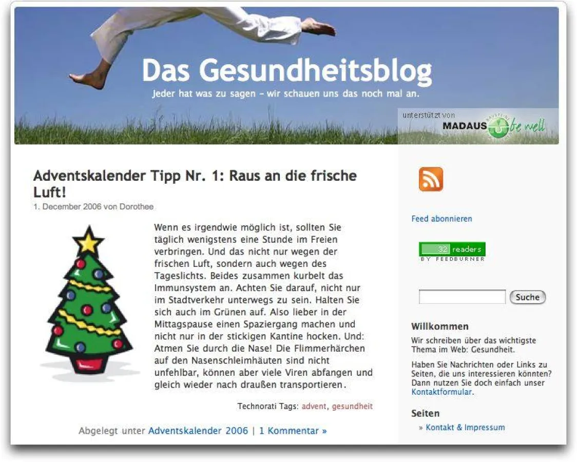 "Das Gesundheitsblog" ist ein Weblog zu einem der Top-Themen im Internet – Gesundheit. Es wird exklusiv unterstützt von "MADAUS be well - Bausteine für's Leben".