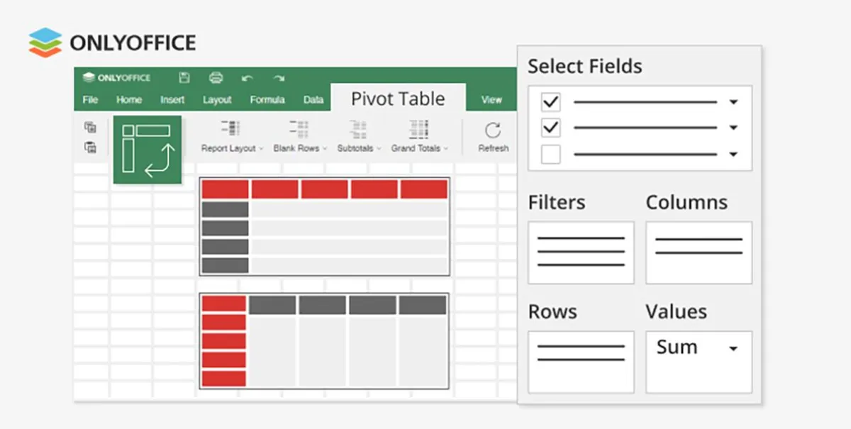 Mit ONLYOFFICE Docs 6.0 erhält der Tabellen-Editor eine Reihe von Funktionen, welche bereits seit längerem von Nutzern angefragt werden. So ist es ab sofort möglich, Pivot-Tabellen zu erstellen und damit umfangreiche Datensätze leichter analysieren zu können. Nach dem Erstellen einer Pivot-Tabelle können Nutzer jederzeit Daten hinzufügen und bewegen oder Filter anwenden, um die Tabelle wie gewünscht anzupassen. Mittels Datenschnitt haben Nutzer zudem Zugriff auf eine Vielzahl schneller Filtermöglichkeiten.